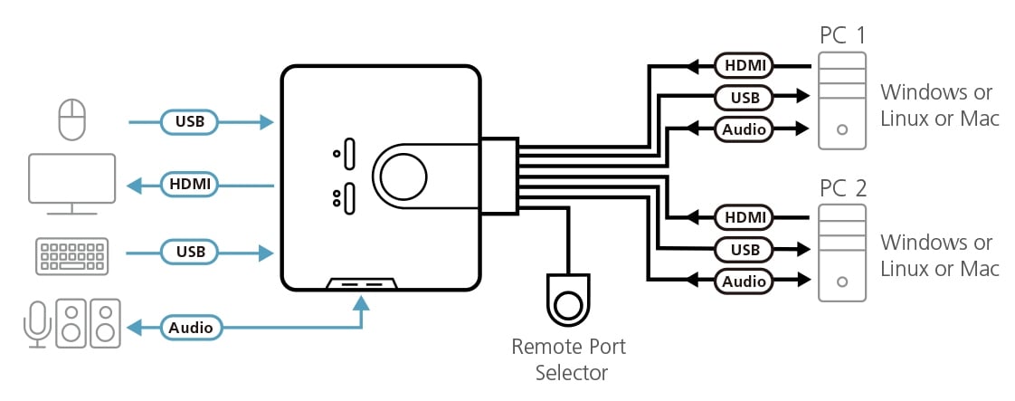 Přepínač umožní ovládat dva počítače z jedné konzole - klávesnicí a myší USB a s monitory HDMI. Plná podpora audia 2.1 kanálu a HDMI obrazu.