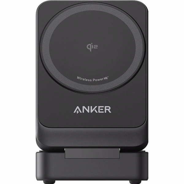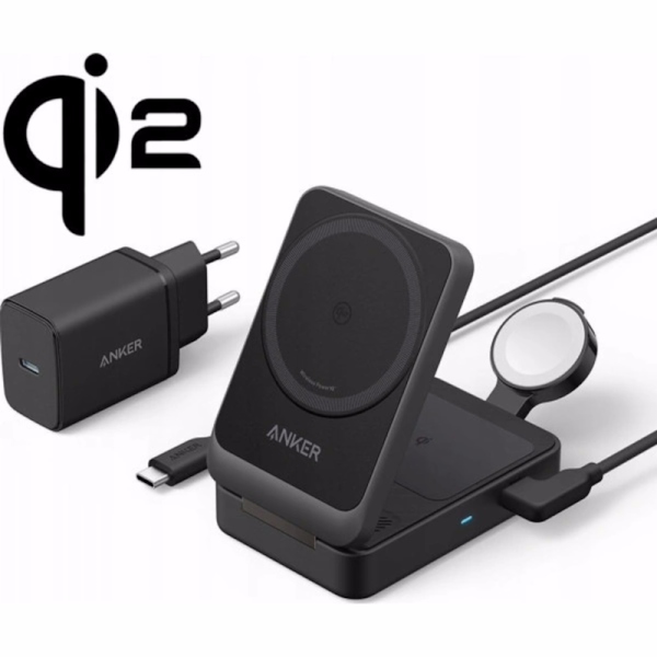 Bezdrátová nabíječka Anker MagGo B2557,výkon 15W,3 v 1: Nabíjejte iPhone, AirPods a Apple Watch, bezdrátové nabíjení kompatibilní s MagSafe, nabíjení s certifikací Qi2, ultrakompaktní skládací design, lze použít jako stojánek, rozměr (složená): 89×60×25mm