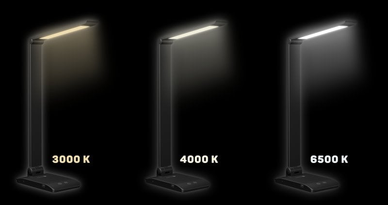 Díky sklopnému rameni a krku nastavíte dokonalý úhel pro jakoukoliv práci. Lampička disponuje USB-A výstupem s výkonem 5 W a dvěma praktickými dotykovými spínači, které umožňují zapnout/vypnout lampu, nastavit 3 úrovně jasu světla nebo nastavit barevnou teplotu světla ve 3 různých úrovních (3000/4000/6500 K).