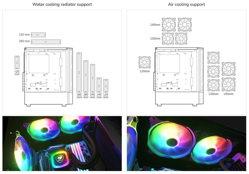 Kompaktní uspořádání MX360 RGB vám umožní nainstalovat šest ventilátorů, 360mm radiátor vodního chlazení a 170mm chladič CPU. Tento obrovský potenciál chlazení vám umožní svobodně si vybírat komponenty.