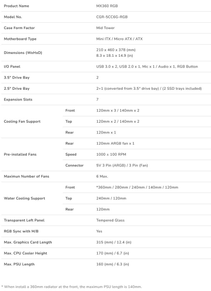MX360 RGB se pyšní atraktivním a úžasným spojením ARGB osvětlení na předním panelu s exkluzivními šikmými pruhy ve tvaru blesků. Silná podpora pro až 360mm radiátor, 315mm grafickou kartu a 170mm chladič CPU vám přináší vynikající hodnotu.