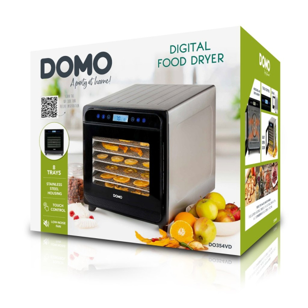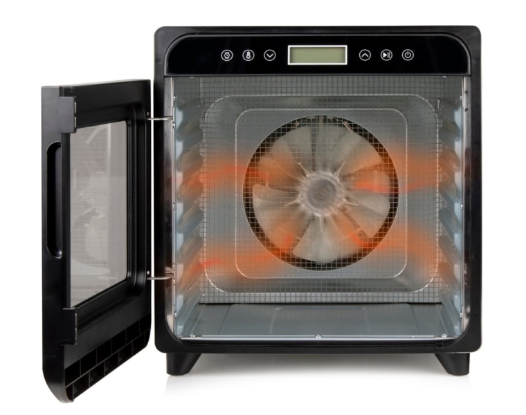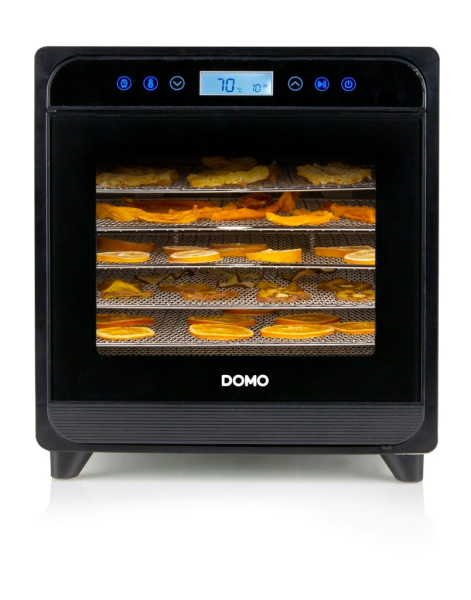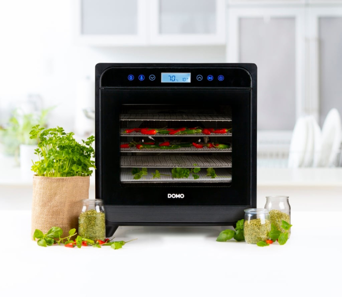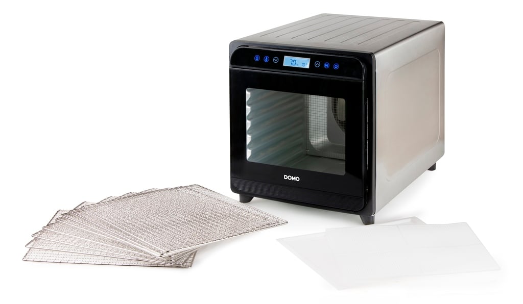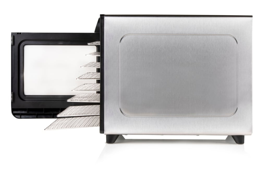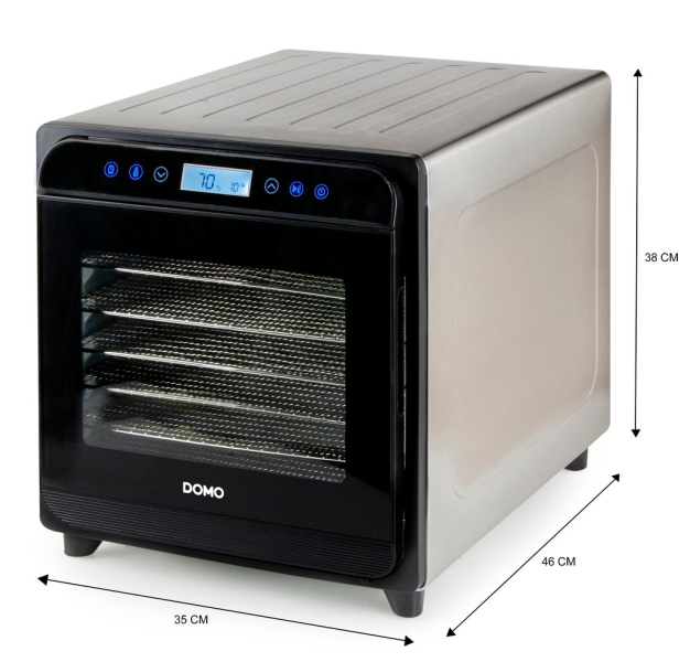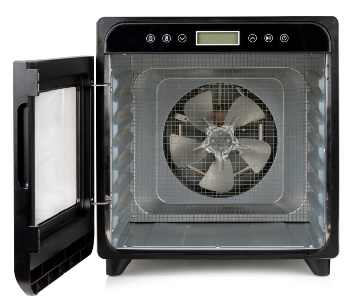 Výkonná a robustní sušička ovoce s tělem z vysoce kvalitního broušeného nerezu vybavená ventilátorem o velkém průměru, přesným digitálním ovládáním teploty a digitálním časovačem. Horizontální rozvod vzduchu zajišťuje rovnoměrné a efektivní sušení v celém objemu sušičky a snižuje hlučnost sušičky na minimum. Zvýšený příkon a rozsah nastavení teploty sušení umožňuje v sušičce efektivně sušit bylinky, ovoce s vysokým podílem vody, maso, nebo na speciálním platu bez otvorů i ovocné placky.