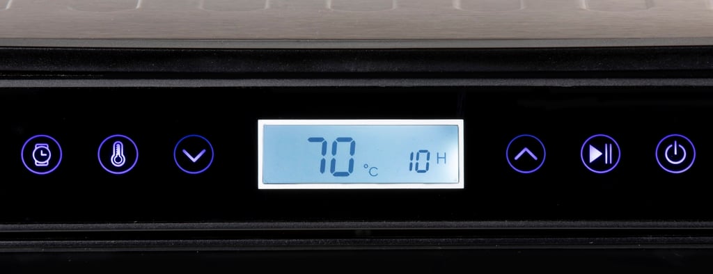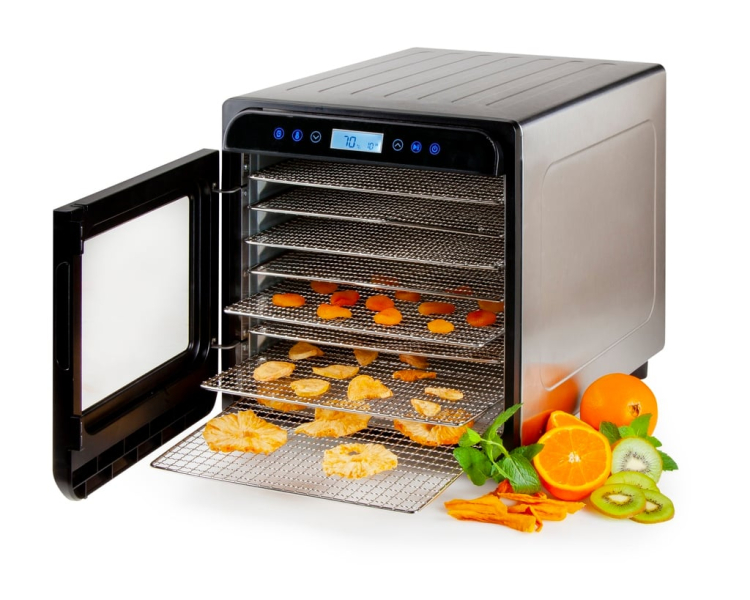 Výkonná a robustní sušička ovoce s tělem z vysoce kvalitního broušeného nerezu vybavená ventilátorem o velkém průměru, přesným digitálním ovládáním teploty a digitálním časovačem.