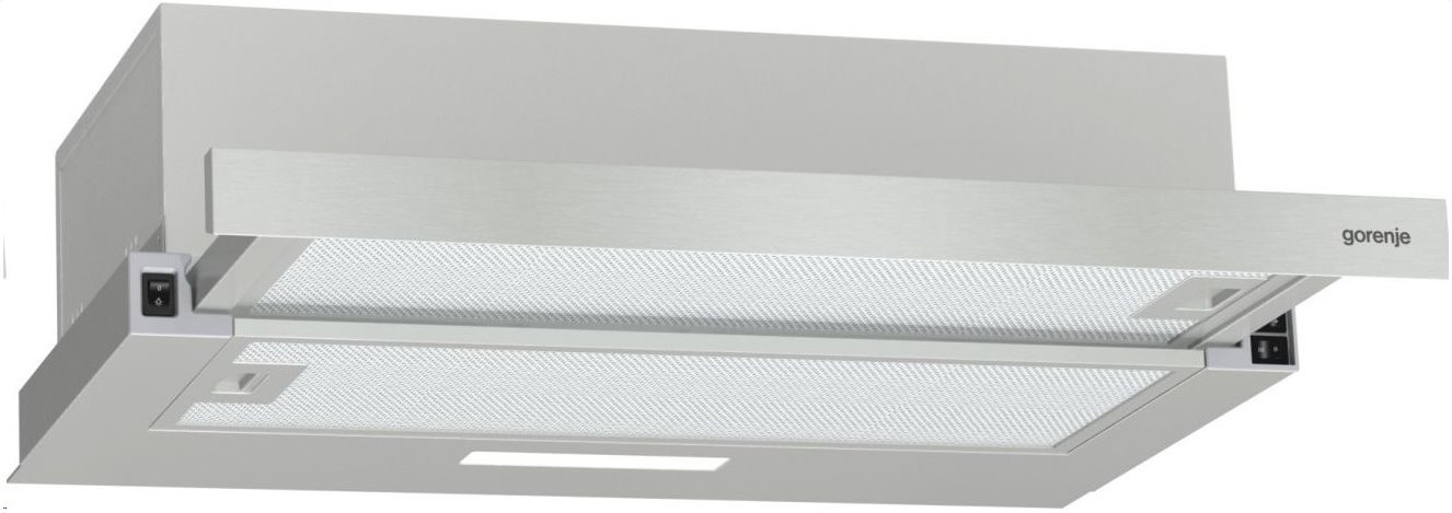Digestoř vestavná a výsuvná 60cm, příkon 110 W • energetická třída C • maximální výkon odtahu 350 m3/h • odsávání do komína • recirkulace vzduchu • 3 stupně výkonu • LED osvětlení • kondenzátorový motor