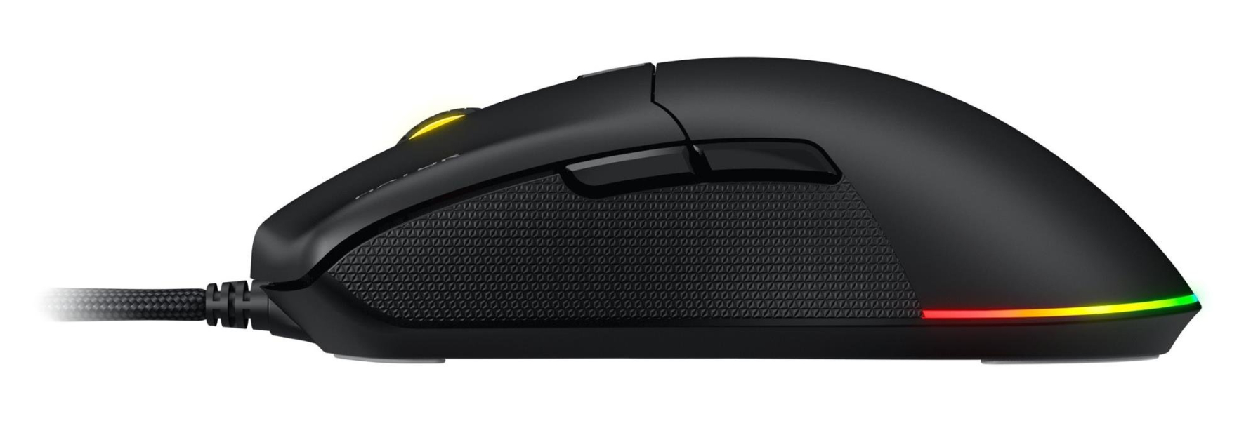 Ultralehká herní myš (62 g) • Symetrický tvar • Senzor PixArt PMW3311 (až 12 000 DPI) • Odolné optické spínače HATOR (100 mil. kliknutí) • RGB osvětlení • 6 programovatelných tlačítek • PTFE kluzné plochy • 1,8m paracord kabel • Černá