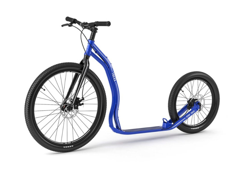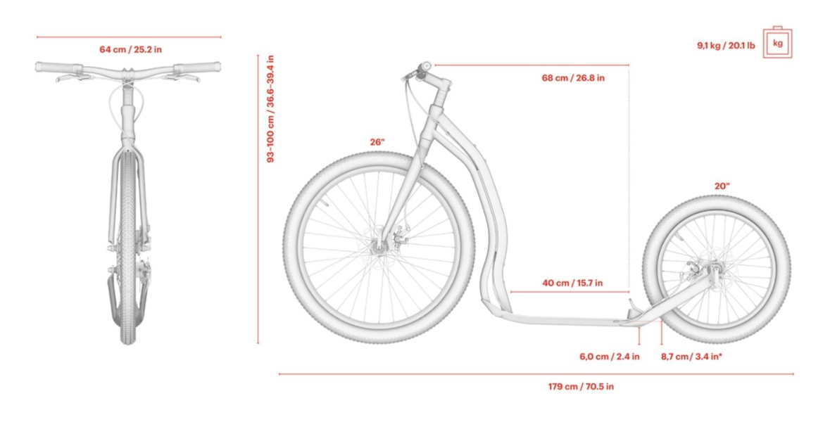 Špičková koloběžka do terénu. Nosnost až 150 kg. Minimální výška jezdce 150 cm. Váha 9,1 kg. Kola 26" a 20". Vhodné od 12 let věku.