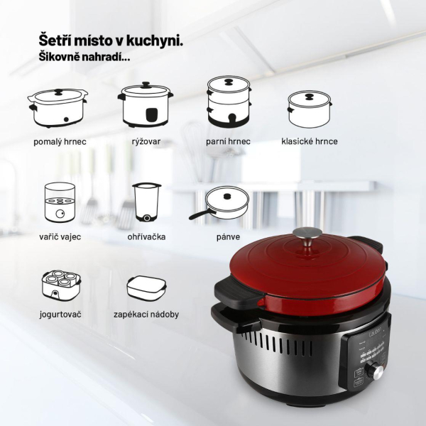 Protože je 21. století v plném proudu, nádobu o objemu 6 l lze vložit i do multicookeru a rázem máte k dispozici 10 přednastavených programů pro snadné a rychlé vaření. Teplotu a čas je však možné upravit i ručně.