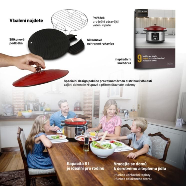 Jídlo připravíte snadno i v páře díky přiloženému pařáčku. Šikovnými pomocníky jsou funkce pro udržování teploty a odložený start. Manipulaci usnadňují přiložené silikonové rukavice a podložka, inspiraci přináší kuchařka.