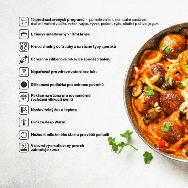 Multifunkční hrnec, objem 6l, litinový smaltovaný hrnec vhodný na sporák či do trouby, vhodné do myčky, 10 programů, napařovač pro ohřev zeleniny, silikonové rukavice v balení, silikonová podložka v balení, regulace teploty, odložený start