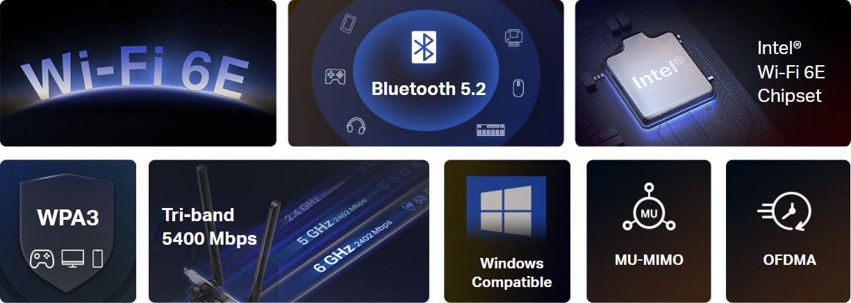 Kompaktní síťová karta do PCIe rozhraní, která je nejen vybavena nejnovějším standardem Wi-Fi 6E (6 GHz), Bluetooth 5.2 ale je také zpětně kompatibilní s 5 GHz (802.11a/n/ac) a 2.4 GHz. Poskytuje extrémní přenosovou bezdrátovou rychlost (2402 Mbps pro pásma 5 a 6 GHz a 574 Mbps pro pásmo 2.4 GHz), ultra nízkou latenci a nepřerušované připojení. Díky těmto vlastnostem si můžete užívat rychlejší stahování, plynulejší streamování a všepohlcující hraní.