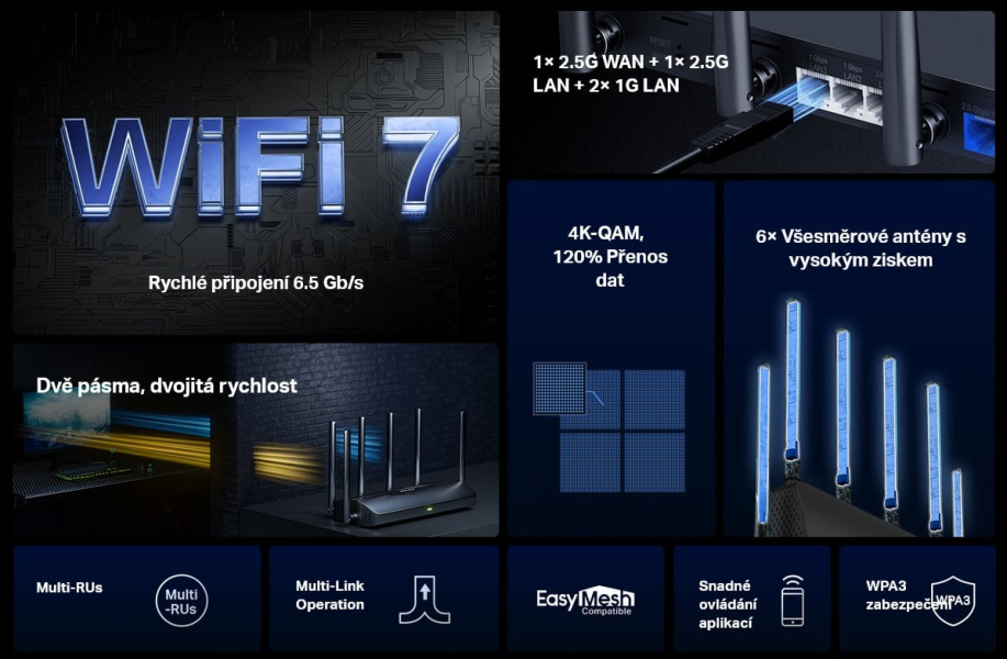 Bezdrátový router s podporou Wi-Fi 7 poskytuje rychlost 688 + 5760 Mbps díky 160MHz kanálům a technologii MLO. Nabízí porty 2.5 Gbps WAN, 2× Gigabit LAN a 1× 2.5 Gbps LAN. Podporuje plynulé 4K/8K streamování, hraní AR/VR a rychlé stahování. Funkce jako WPA3 šifrování, Beamforming a MU-MIMO zajišťují bezpečné a stabilní připojení. Kompatibilita s EasyMesh a operační módy AP Router i Access Point přidávají flexibilitu pro domácí i firemní sítě.
