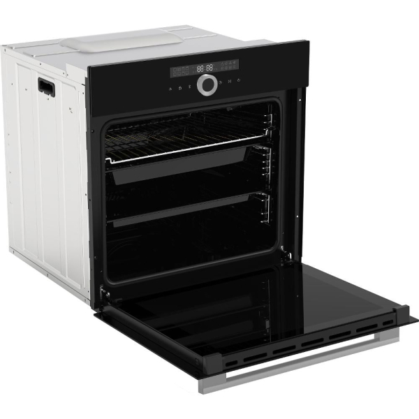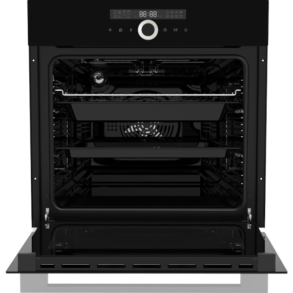 Využít můžete 11 přednastavených receptů a nechat se troubou vést krok za krokem. Komfortní ovládání zajišťuje dotykový panel v kombinaci s otočným knoflíkem a dobře čitelný bíle podsvícený displej. Bezpečnostní prvky jako teleskopický výsuv, trojité prosklení dveří a dětská pojistka ochrání i ty nejmenší. A snadné čištění smaltovaného vnitřku párou SteamClean jen dokazuje, že se jedná o špičkový spotřebič pro náročné kuchaře i každodenní vaření.