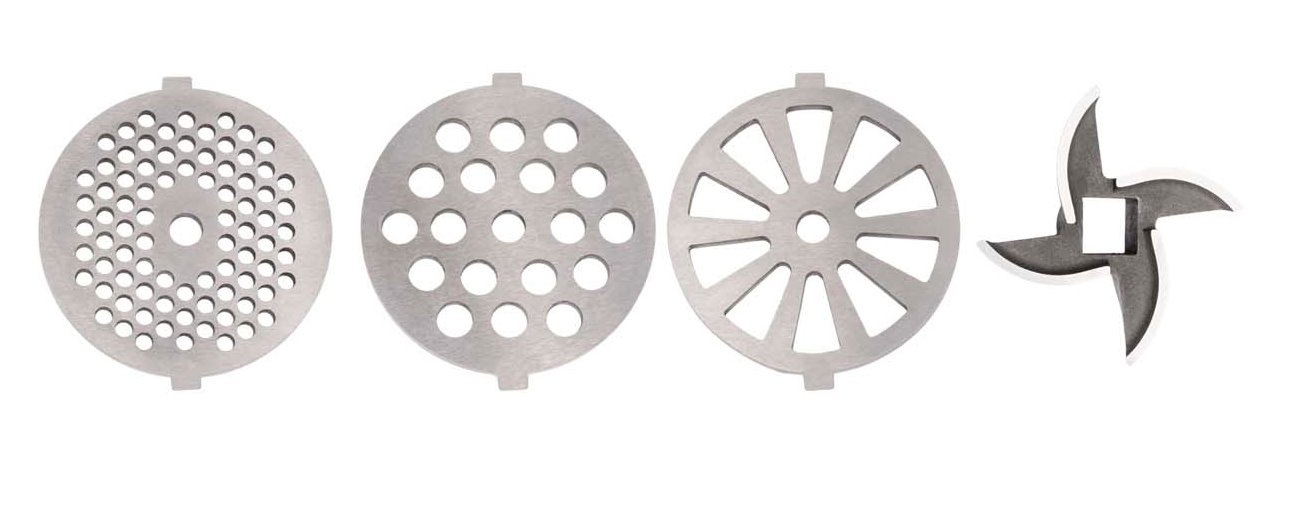 3 protlačovací kotouče na jemné (4 mm), střední (7 mm) a hrubé (trojúhelníkové) mletí. Místo pro příslušenství a pro kabel.