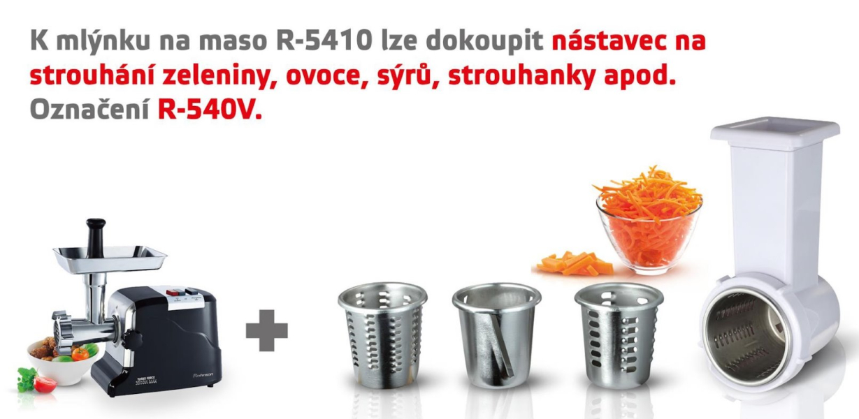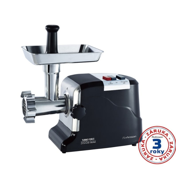 ROHNSON R-5410 Mlýnek na maso, 3 protlačovací kotouče na jemné (4 mm), střední (7 mm) a hrubé (trojúhelníkové) mletí, Bezpečnostní pojistka proti přehřátí motoru