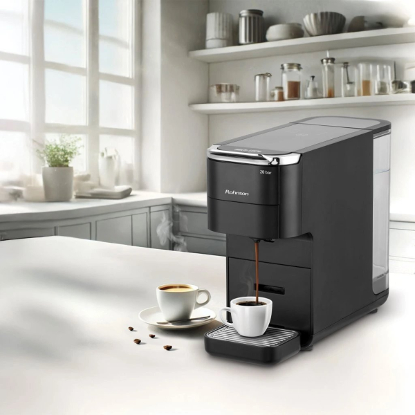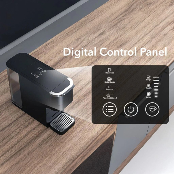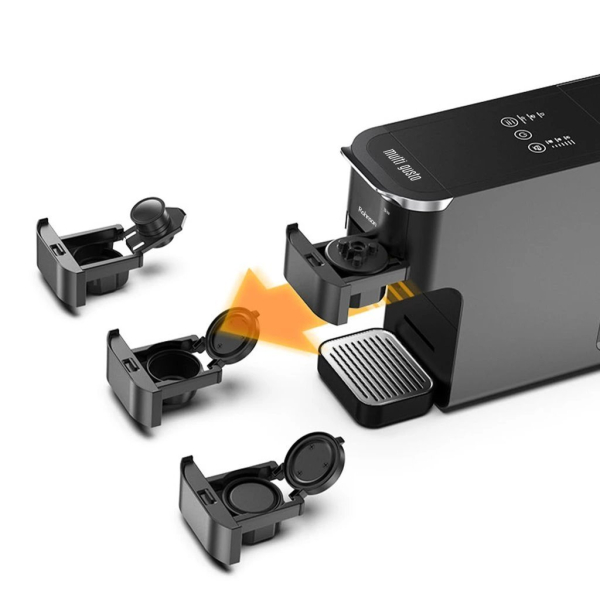 Kávovar na kapsle značky Nespresso, Dolce Gusto Lavazza Blue, ESE pody a na mletou kávu, s příkonem 1215-1545W, vysokotlaká extrakce 20 barů, 7 úrovní množství hotové kávy, odnímatelný průhledný zásobník na vodu o objemu 1,5 l.