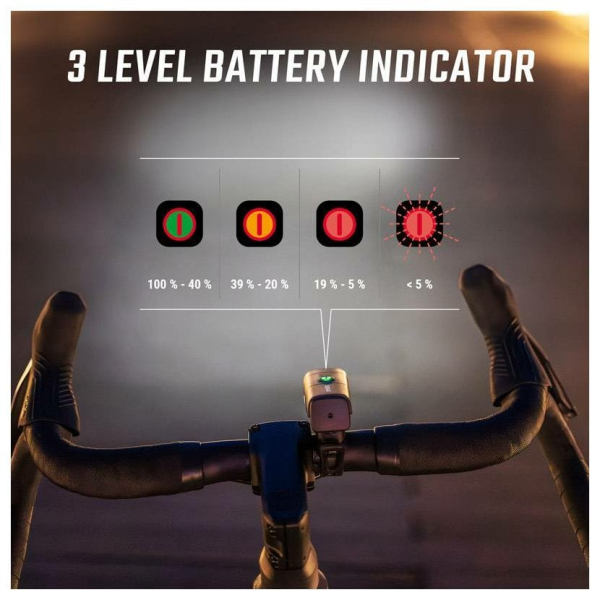 Třistupňový indikátor stavu baterie zobrazuje stav baterie jak při nabíjení, tak při svícení. Aktuální stav nabití akumulátoru zobrazuje indikátor integrovaný v tlačítku ON/OFF. Barva Led diody indikuje zbývající kapacitu baterie.