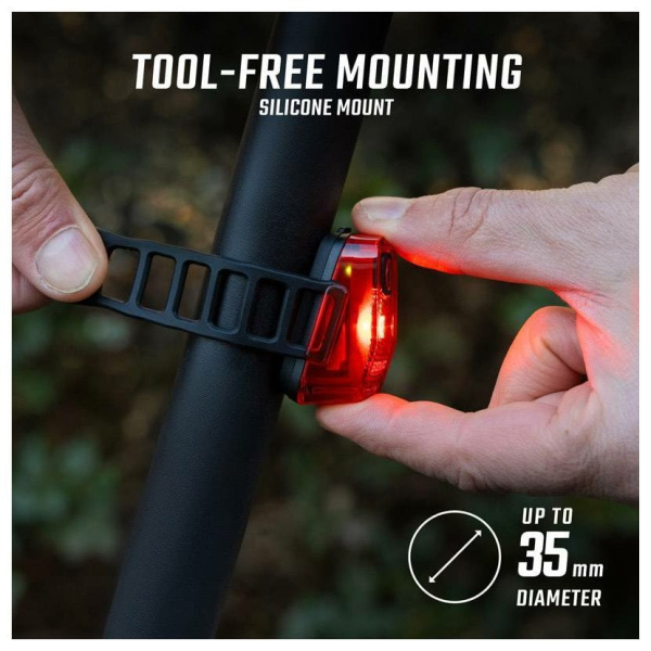 K montáži HIRO 10 nepotřebujete žádné nářadí. Díky pružnému silikonovému pásku jej lze snadno a během několika sekund připevnit ke všem standardním sedlovkám.