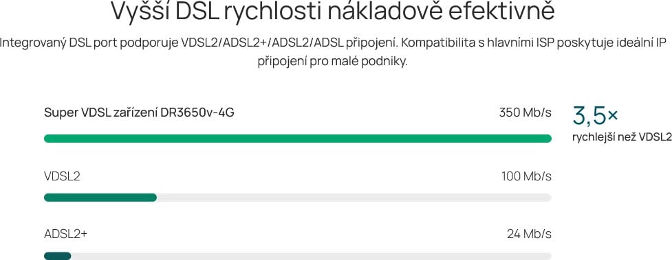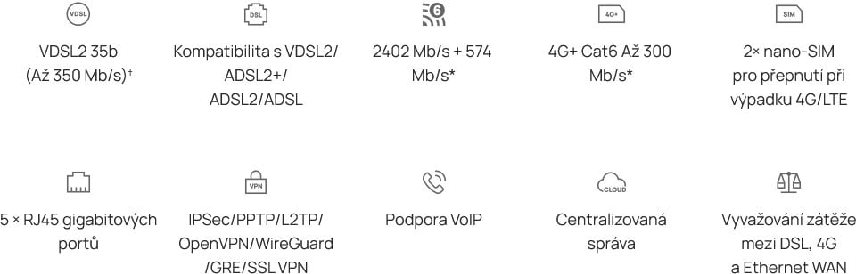 AX3000 Wi-Fi 6 DSL Gateway s rychlostí až 2402 Mb/s na 5 GHz a 574 Mb/s na 2,4 GHz, která poskytuje spolehlivé a vysokorychlostní připojení pro všechny domácí i kancelářské aplikace. Kombinace Super VDSL, kabelového internetu přes WAN a záložní mobilní 4G+ (Cat 6) (po připojení 4G USB donglu) zajišťuje nepřerušovaný přístup k internetu i při výpadku primární konektivity, což umožňuje hladké streamování, cloudové služby a plynulou videokonferenci.